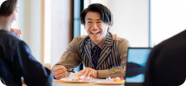 会議のリフレッシュとメンバーのコミュニケーションを目的に、どの会議にもおやつタイムを設けています。持ち回りで各々が推し菓子を用意するチームもあります。 -