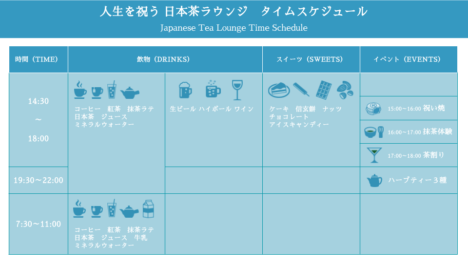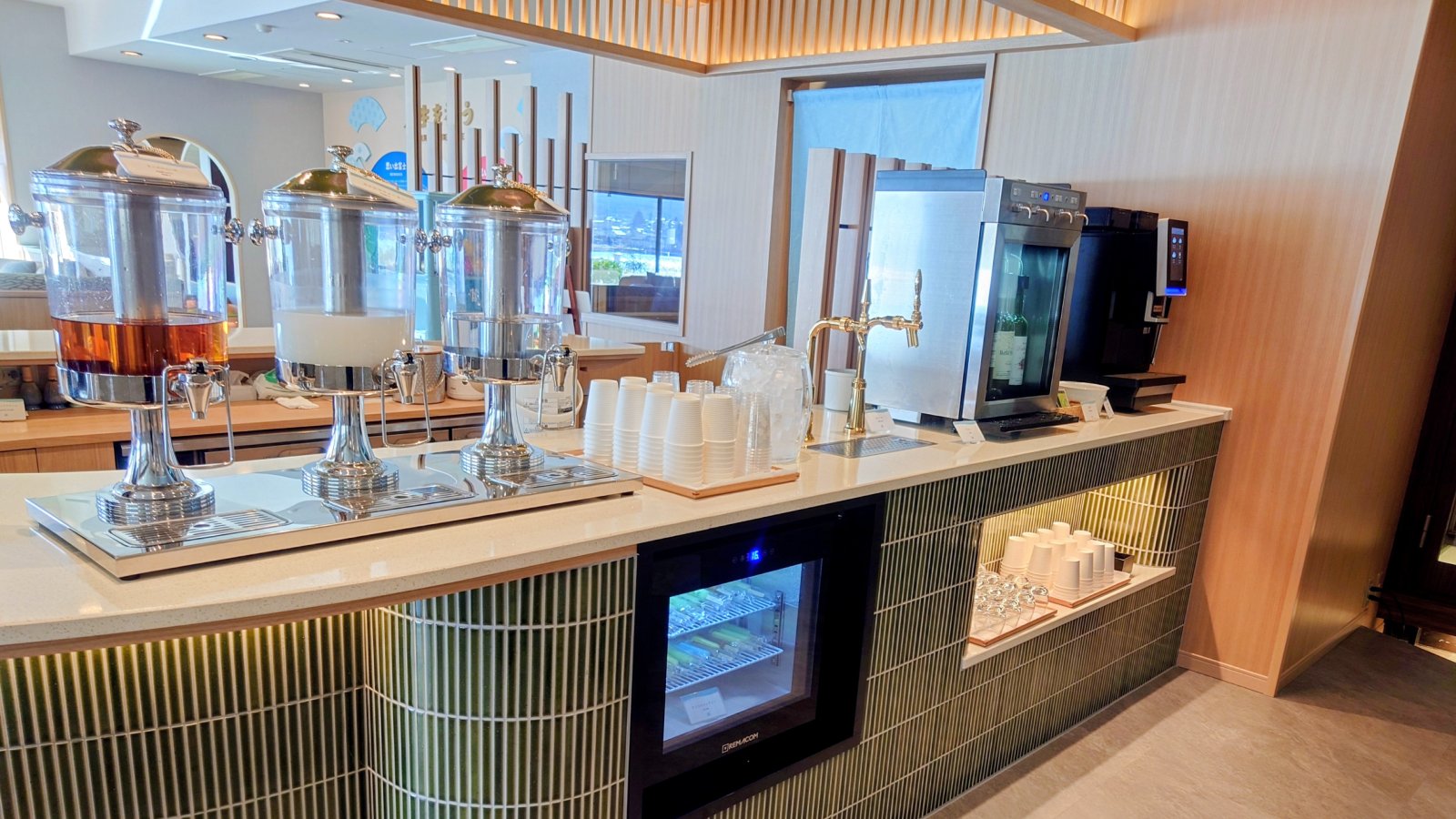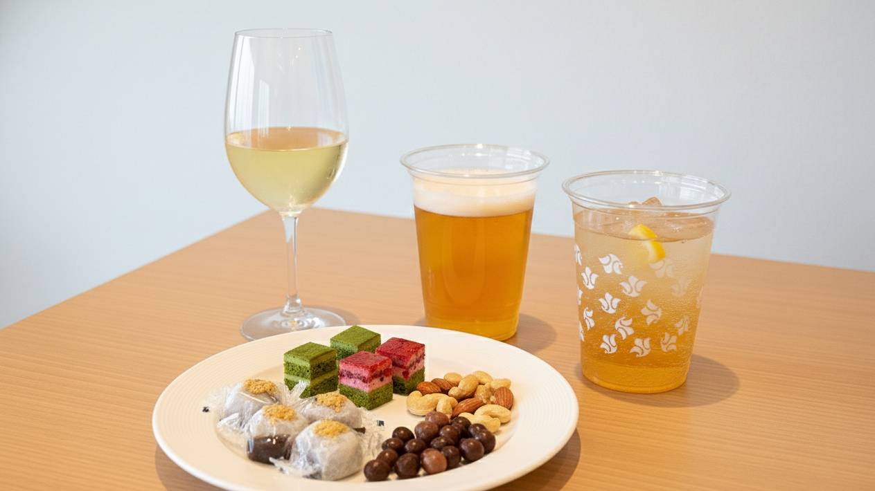 ソフトドリンクのほか、アルコールやおやつ、時間ごとに変わるおもてなしをお楽しみください。このひとときが、人生にカンパイとなりますように。